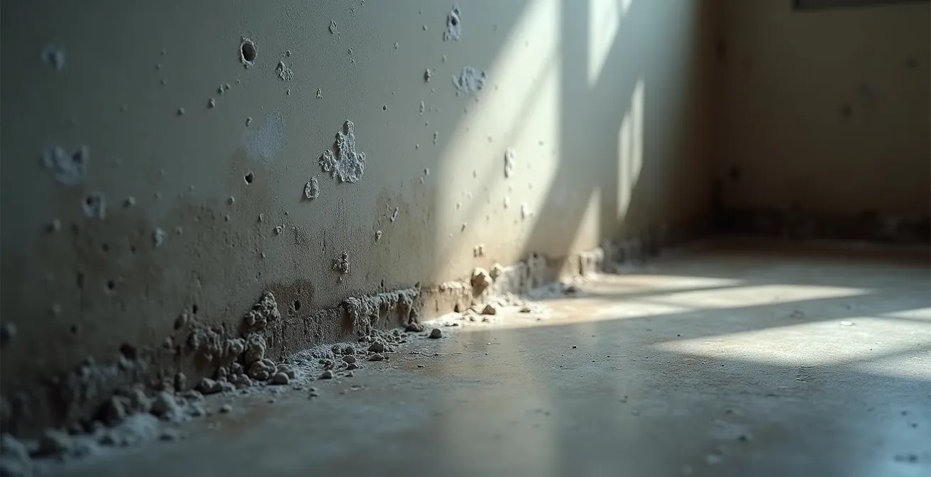 Avant d’envisager un remplacement, qui représente des travaux d’excavation majeurs et coûteux (entre 150 $ et 250 $ par pied linéaire au Canada), il est impératif de confirmer le diagnostic. Plusieurs signes avant-coureurs peuvent indiquer un drain français défaillant. L’apparition d’efflorescence, un dépôt poudreux blanc à la base des murs de béton du sous-sol, est un indice classique. Il s’agit des sels minéraux laissés par l’eau qui s’est infiltrée à travers le béton et s’est évaporée. Une pompe de puisard qui fonctionne sans arrêt, même plusieurs jours après une pluie, est un autre signal d’alarme : l’eau n’est plus correctement canalisée et s’accumule autour des fondations.