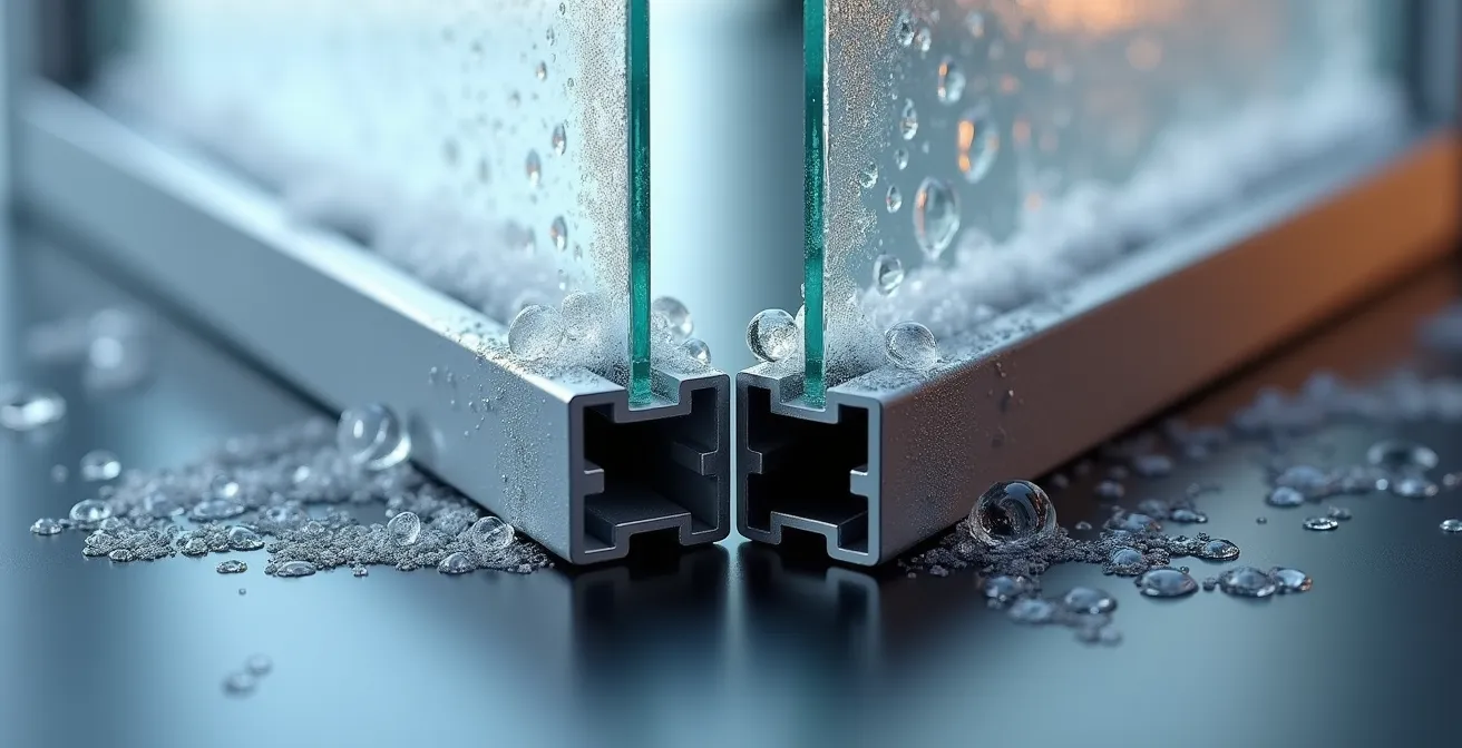 La discussion se concentre habituellement sur l’épaisseur du verre ou le type de gaz, mais ces éléments de haute performance sont rendus inefficaces si l’intercalaire, cette petite bande qui sépare les vitres, est en aluminium. Ce métal, excellent conducteur thermique, crée un véritable pont thermique, une autoroute pour le froid extérieur vers votre intérieur. Il annule une grande partie des bénéfices pour lesquels vous avez payé. La véritable question pour garantir le confort et la durabilité n’est donc pas seulement « quel vitrage ? », mais « quelle est la nature de l’armature qui maintient ce vitrage ? ».